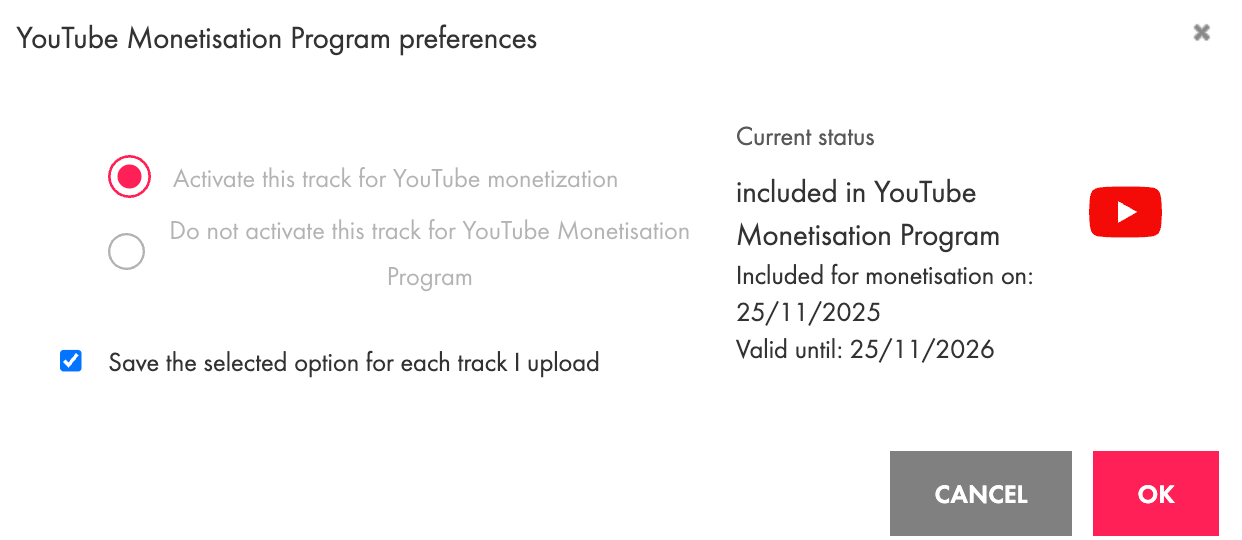 - A pop-up window will appear. Select Activate this track for YouTube monetization and click OK.