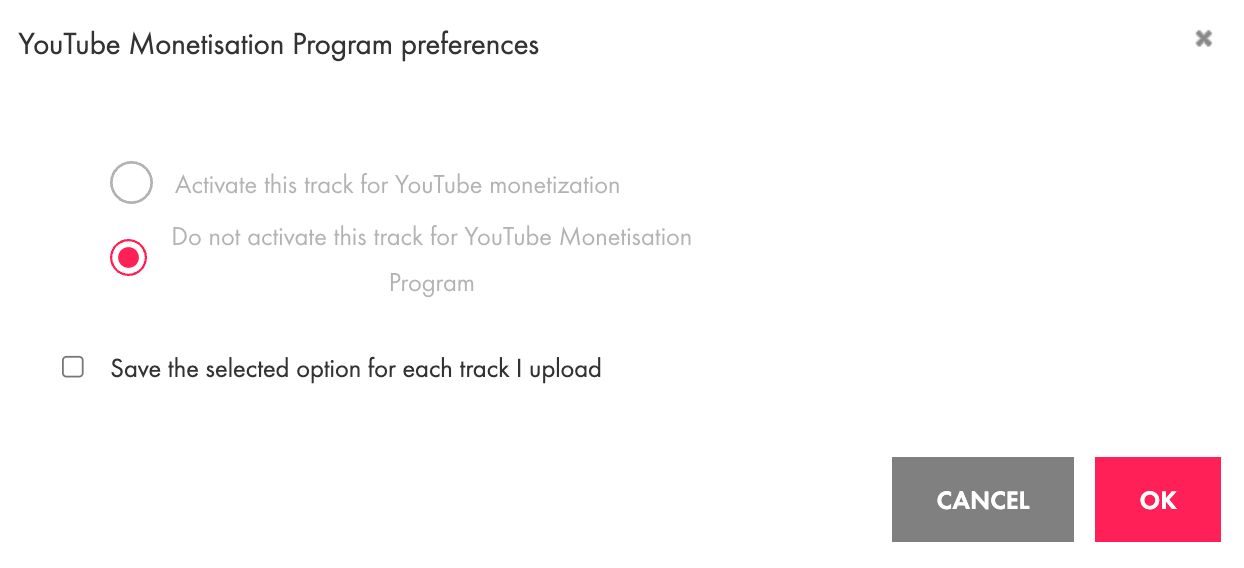 - A pop-up window will appear. Select Do not activate this track for YouTube Monetisation Program and click OK.